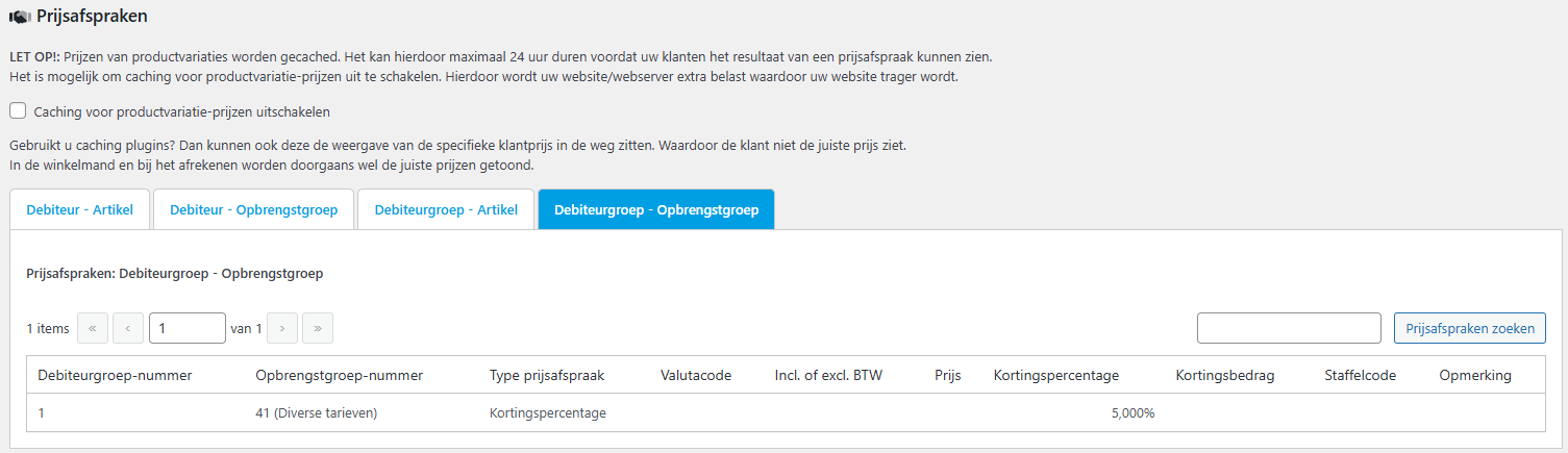 WooCommerce kent standaard geen prijsafspraken. Via onze plugin kunnen we echter wel prijsafspraken gebruiken. Hiervoor moeten de prijsafspraken met de webshop worden gesynchroniseerd. De prijsafspraken worden hierdoor in de webshop opgeslagen.