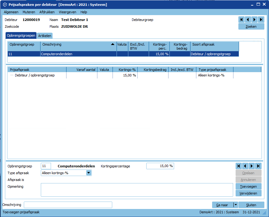 Een eventuele orderkorting voor de debiteur of debiteurgroep wordt bovenop de prijsafspraken berekend.